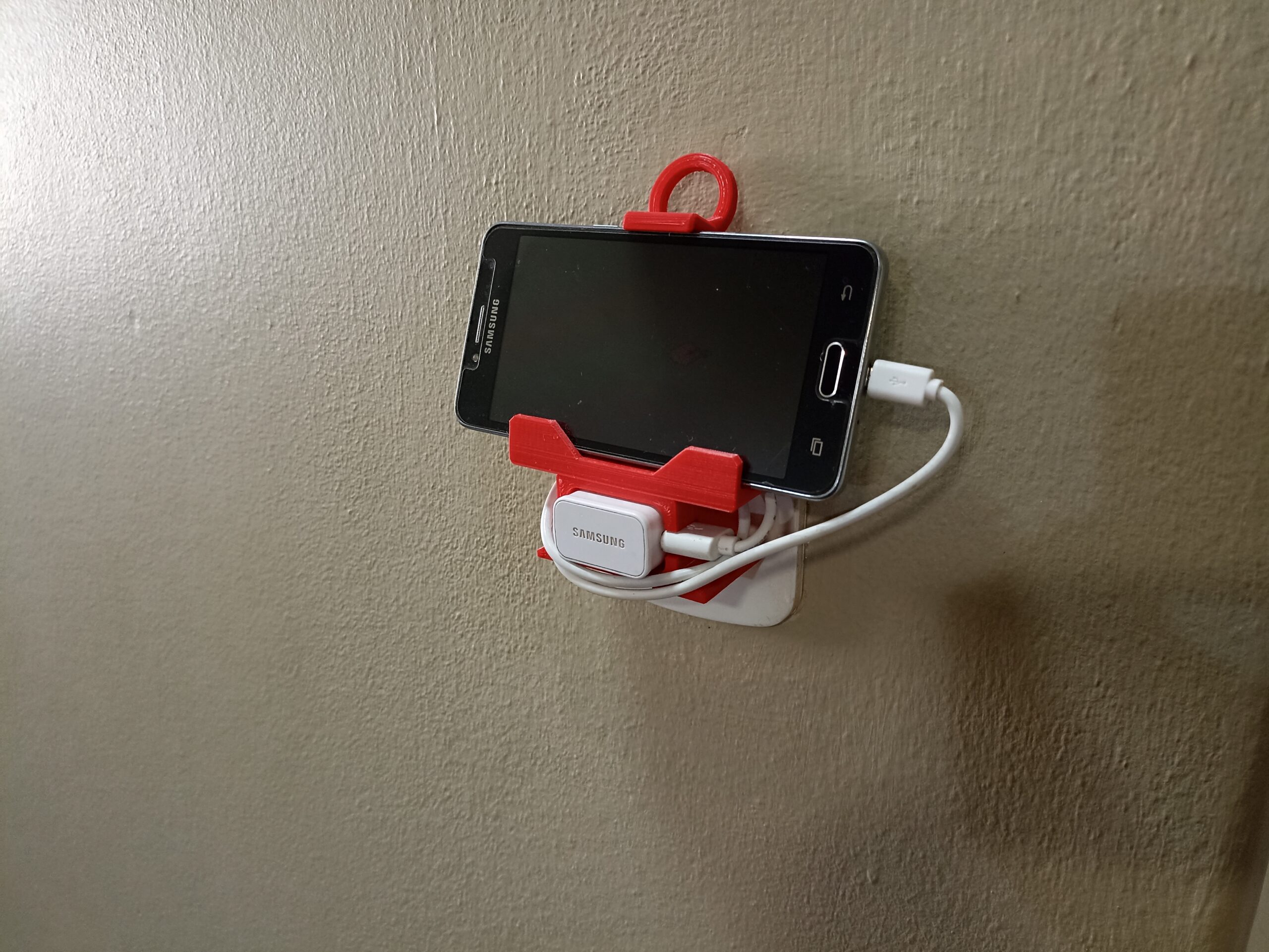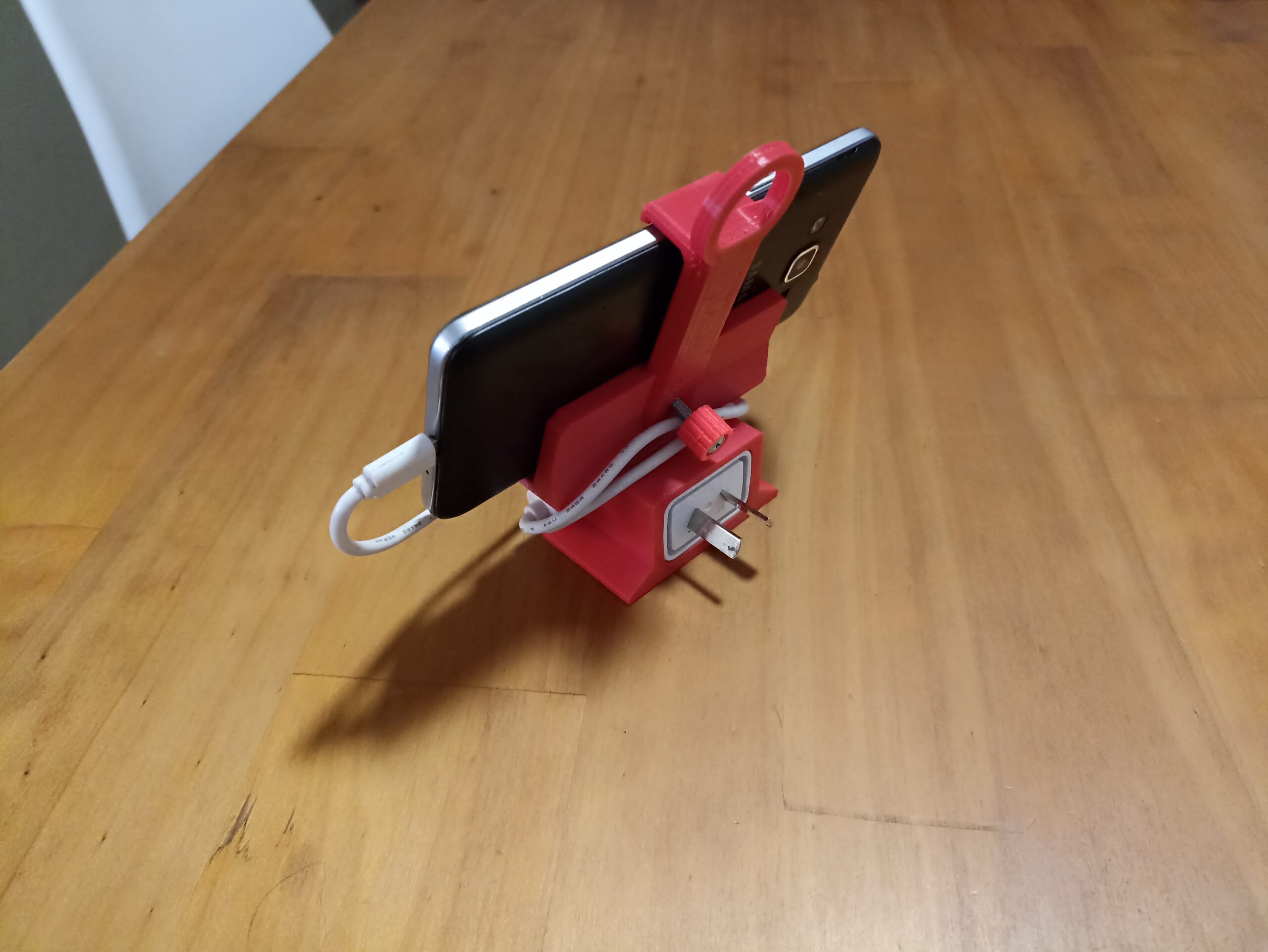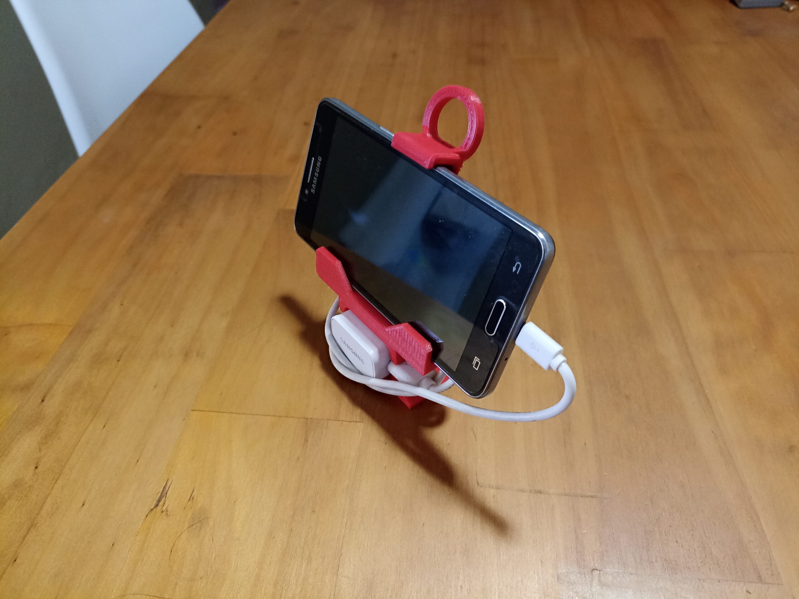 Soporte celular con cargador transportable, realizado para usar un viejo smartphone como pantalla de visualización de cámara de vigilancia tipo babycall.